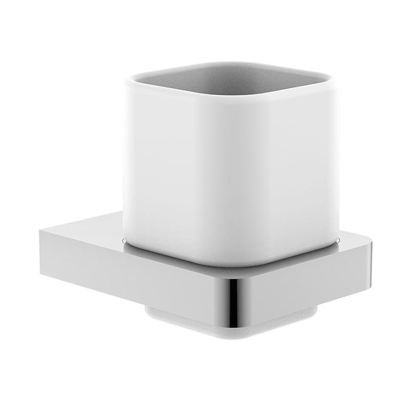 Chrome-plated, metal, wall-mounted toothbrush cup holder with porcelain cup.
