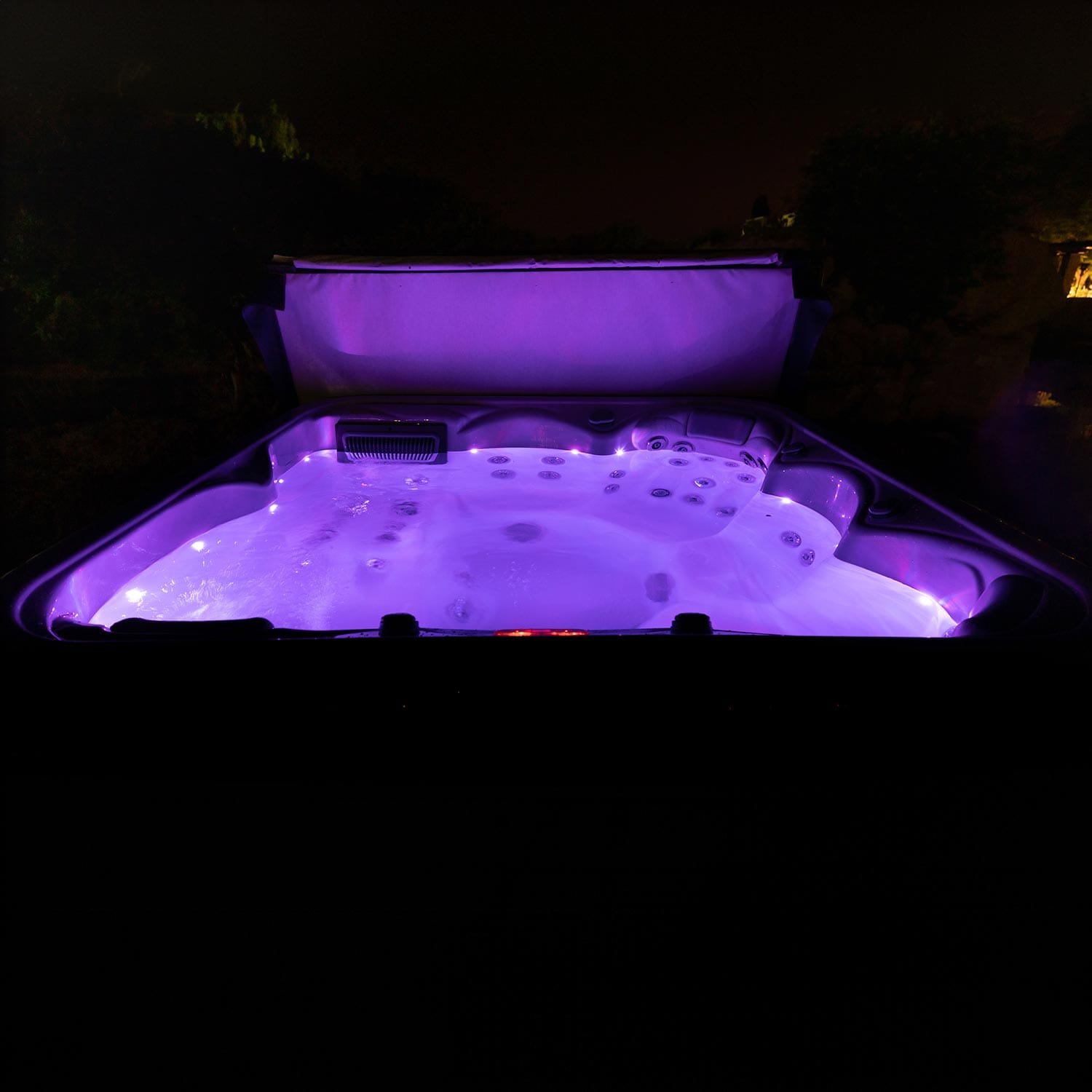 The exclusive chromotherapy light is a direct underwater mood light integrated into the spa’s side wall. It consists of 10 to 20 LEDs, depending on the type of spa, which light up in harmony with the central underwater chromotherapy lighting installed in the spa.